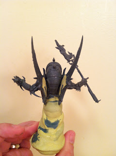 First up, the model itself is the upper half of the Tomb Kings Necrosphinx model (I think that's what it is called) and a foam armature I made and scuplted over with miliput. The arms come from the Daemon Prince kit. The wings were the original model's arm blades. I simply glued them onto the back of the model for a cool take on wings.